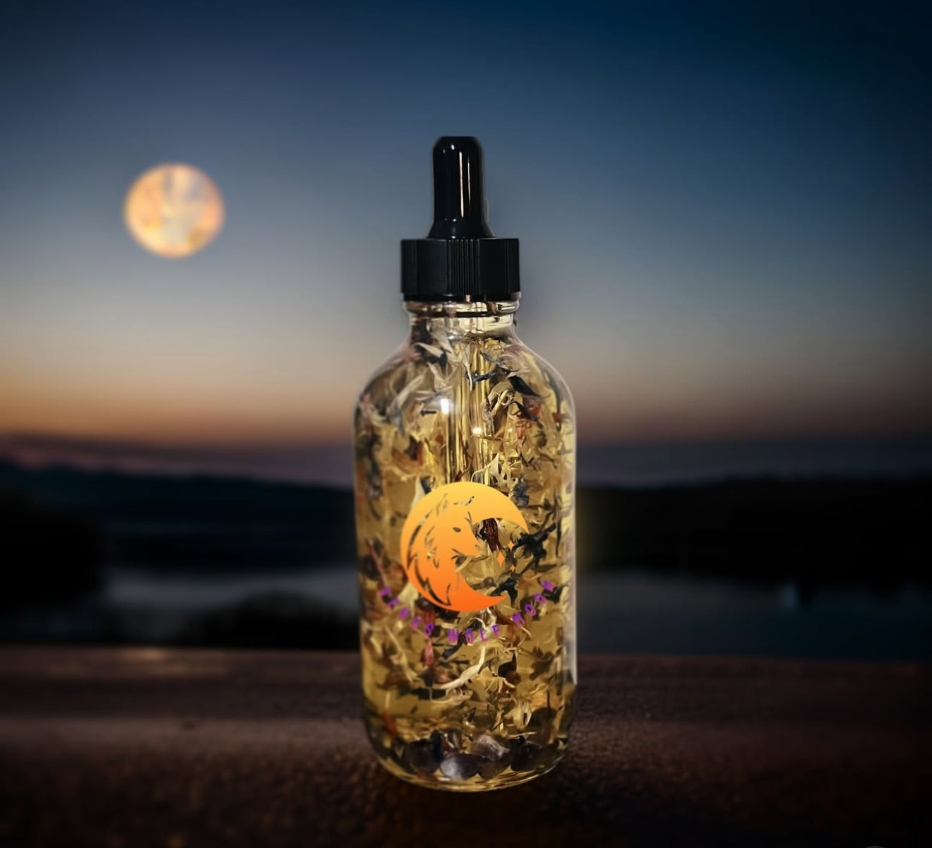 Our Moon Goddess Body Oil is a blend of rejuvenating and moisturizing oils that are infused with corn flower botanicals and charged with amethyst crystal chips enticing the wearer with the delicate and luxurious scent that is fit for a Goddess herself. This body oil not only hydrates your skin giving it a nice healthy glow but serves as a natural light perfume as well.